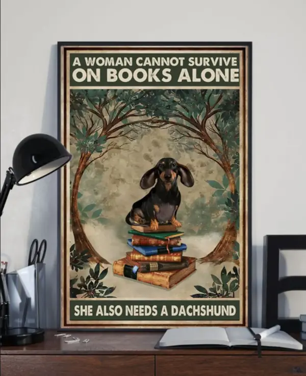 Dachshund Lover's Book Poster - "A Woman Cannot Survive on Books Alone"