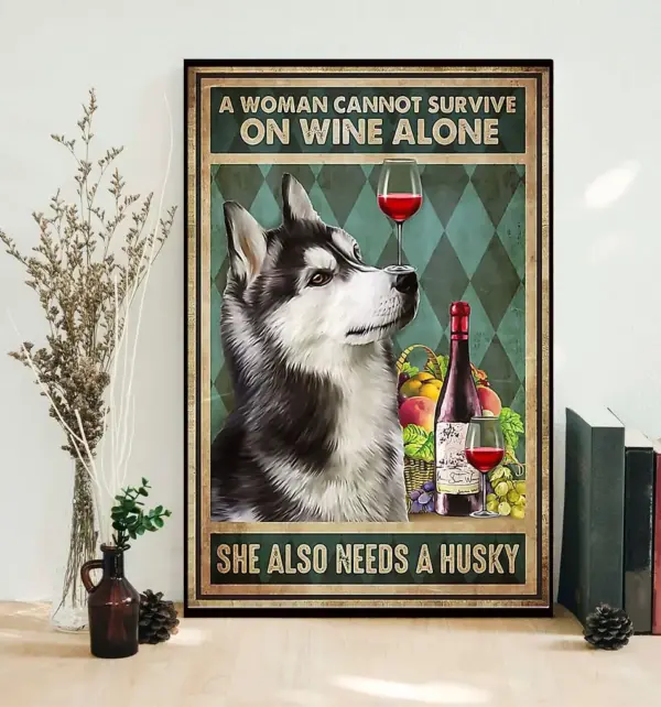 A Woman Cannot Survive On Wine Alone She Also Needs A Husky Poster Canvas