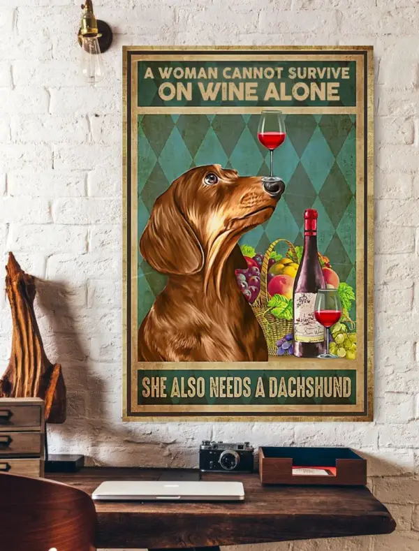 A Woman Survie On Wine And A Dachshund Vertical Print Poster