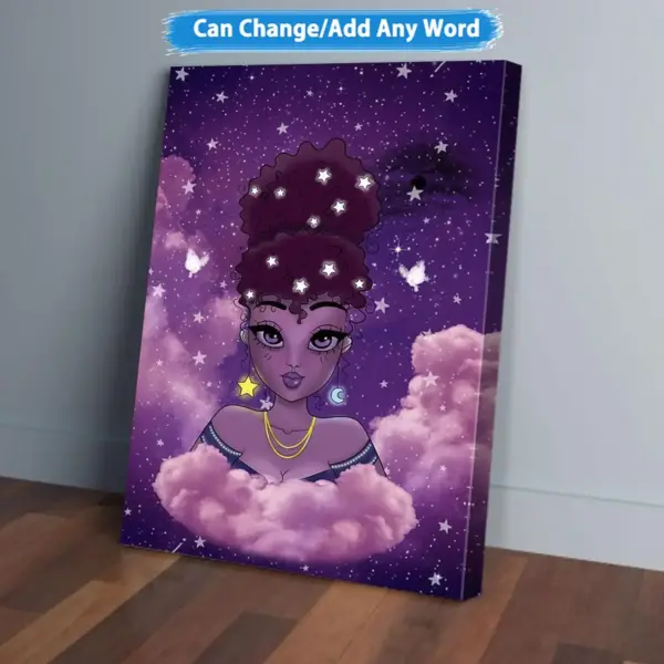 Beautiful purple moon and star canvas wall art featuring an Afro Princess design. Perfect home decor, housewarming gift, or family addition. Adds style and charm to any room.