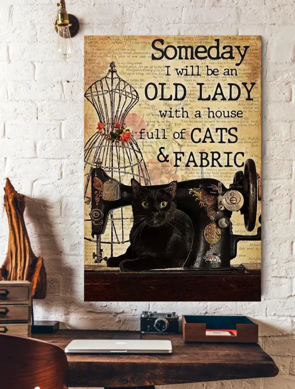 An Old Lady With A House Full Of Cats And Fabric Sewing Machine Poster