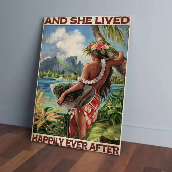 And She Lived Happily Ever After Hawaii Girl Surfing Canvas Wall Art Hang Poster Print Family New Home House Decor Gift Housewarming Gift