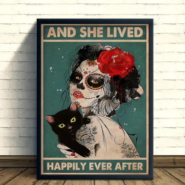And She Lived Happily Ever After Poster Black Cat Print Wicked Witch Halloween Witch Poster Sugar Skull Canvas Print Framed Poster