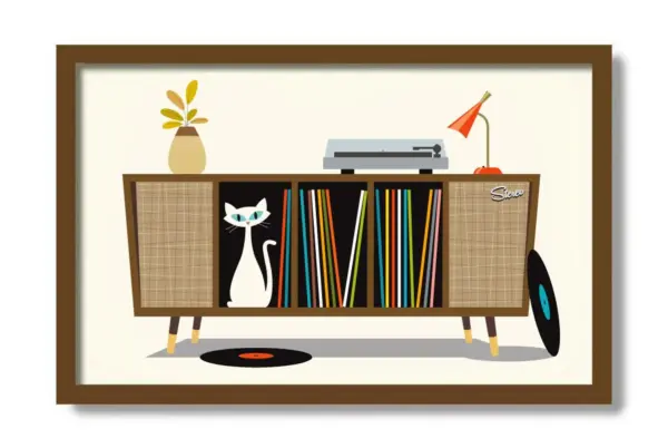 Audiophile Gift Mid Century Modern Art White Cat Art Print Turntable Stand Vinyl Record Storage Record Player Cat Lover Gift Vinyl Lp