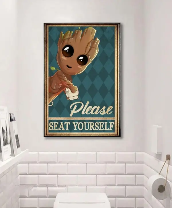 Cute Baby Groot bathroom poster! Funny wall art featuring Baby Groot with a "Please Seat Yourself" design. Perfect for adding a quirky touch to your bathroom.
