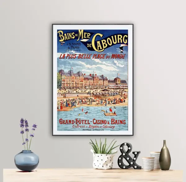Elegant vintage poster capturing the timeless beauty of Cabourg's stunning coastline, perfect for travel art lovers and French decor enthusiasts.