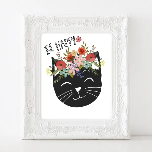 Be Happy Cat Printable Wall Art Inspirational Quote Print Home Decor Floral Flowers Black Cat Lover Poster Pet Art Instant