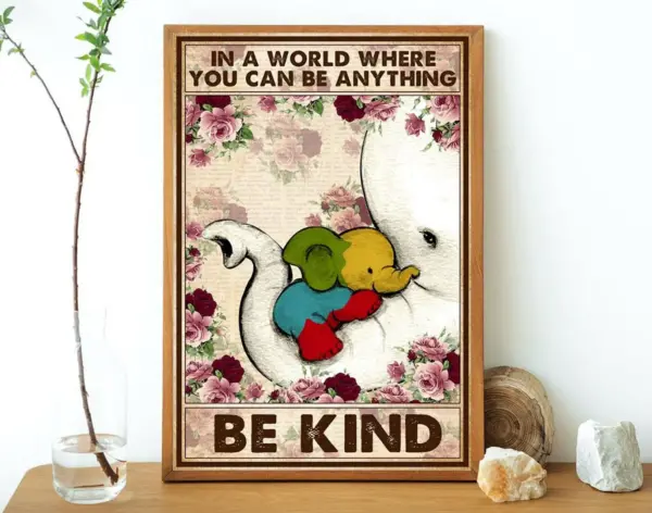 Be Kind In A World Where You Can Be Anything Poster Elephant And Baby Flowery Elephant Lovers Vertical Poster No Framed