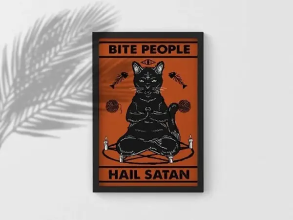 Bite People Hail Satan Poster Black Cat Print Satan Wall Art Funny Cat Poster Black Cat Art Satan Cat Print Signs For Home