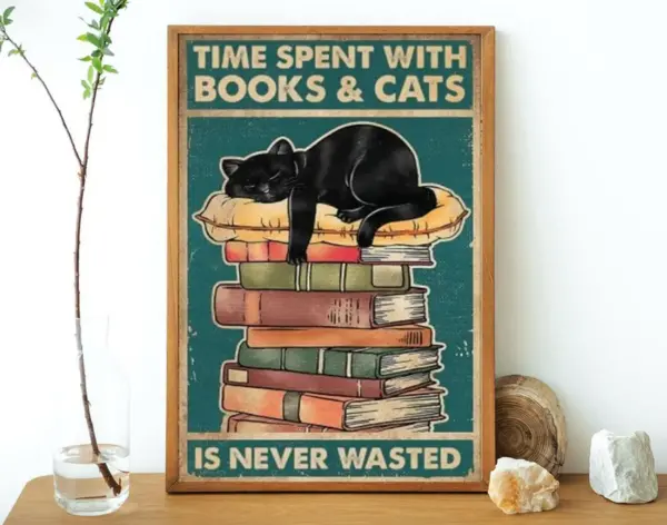 Black Cat And Book Lovers Time Spent With Books And Cats Is Never Wasted Poster Gift For Book Lover Home Decor Vertical Poster No Framed