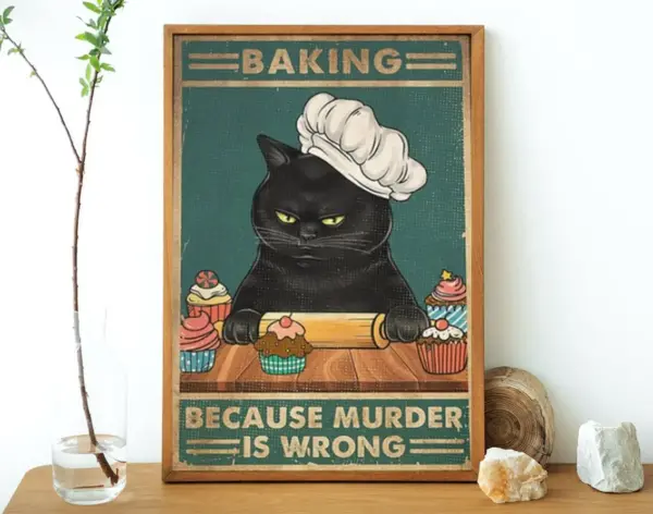 Black Cat Baking Because Murder Is Wrong Poster Vintage Cat Baking Poster Gift For Bakers Cat Lovers Baking Vertical Poster No Framed