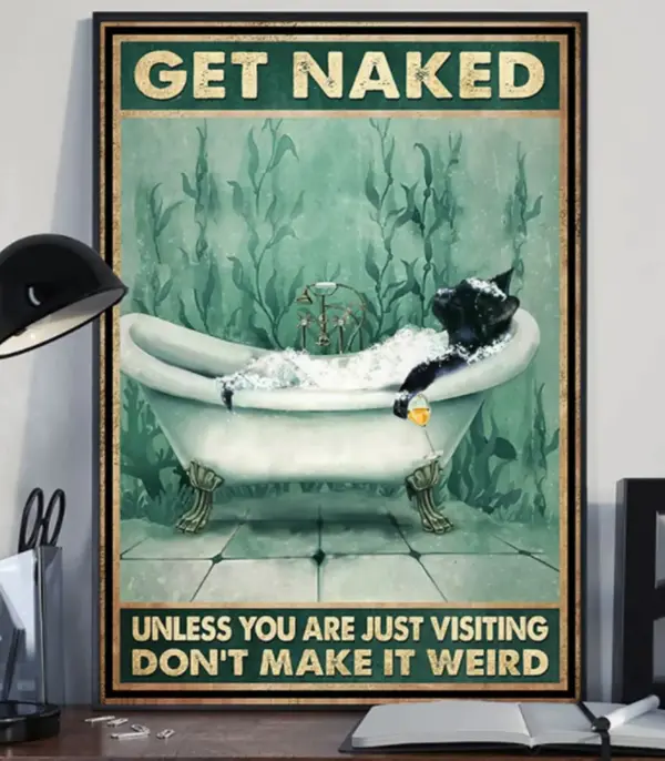 Black Cat Get Naked Poster Cat With Wine In Bathroom Poster Funny House Decoration