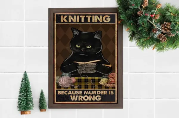 Black Cat Loves Knitting Because Murder Is Wrong Poster Knitting Lover Poster Funny Cat Vintage Poster No Frame