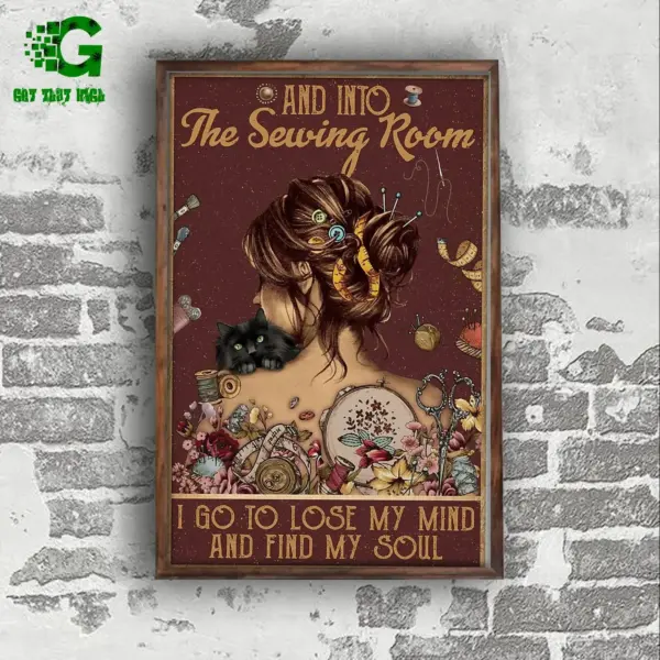 Black Cat Poster Cat Lover Black Cat Girl And Into The Sewing Roomwall Art Home Decor Poster Print
