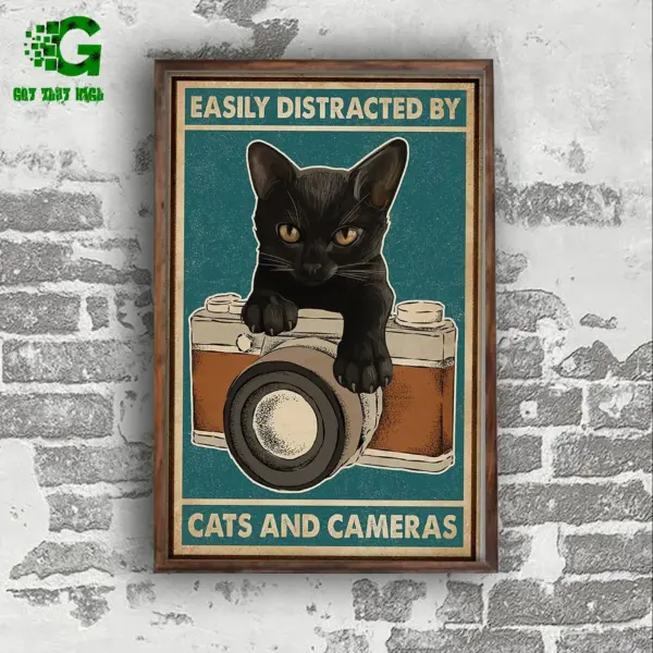 Black Cat Poster Cat Lover Black Cat Retro Teal Easily Distracted Camera And Cat Wall Art Home Decor Poster Print