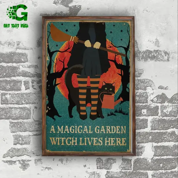 Black Cat Poster Cat Lover Black Cat Retro Teal Garden Witch Lives Here Wall Art Home Decor Poster Print