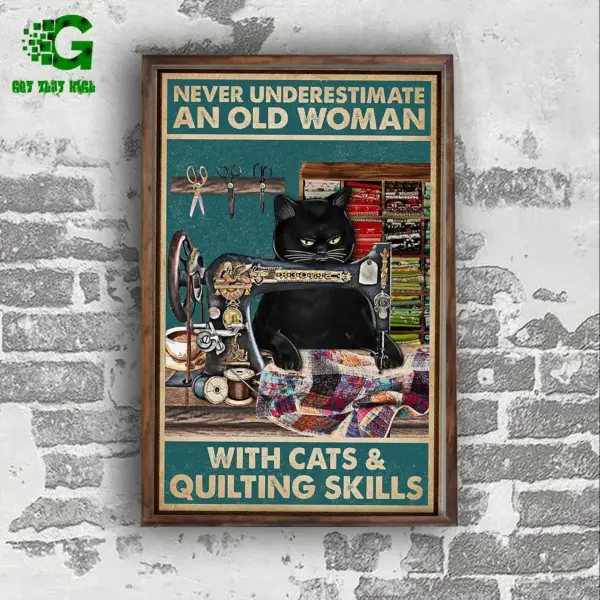 Black Cat Poster Cat Lover Never Underestimate An Old Woman Quilting Skills Wall Art Home Decor Poster Print