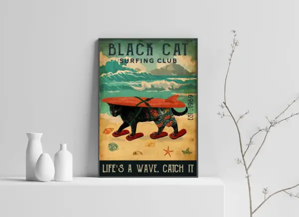 Black Cat Poster Surfing Club Wall Decoration Cat Signs For Home Kitty Poster Funny Kitty Cat Artwork Funny Cat Sign Pet Poster
