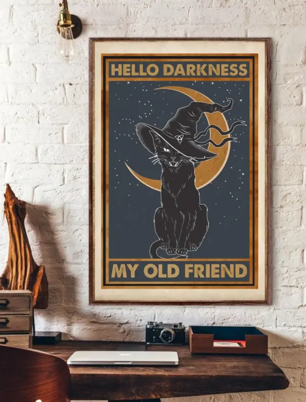 Black Cat Witch Halloween Hello Darkness My Old Friend Poster Funny Kitty Poster Moon Poster Cat Lover Poster Halloween Gift Poster