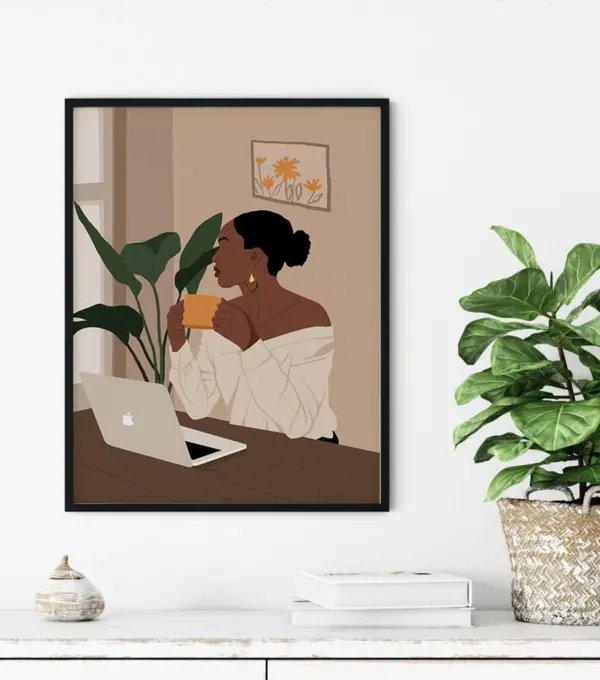 Black Woman Coffee Lover Canvas Art - Boho Wall Decor