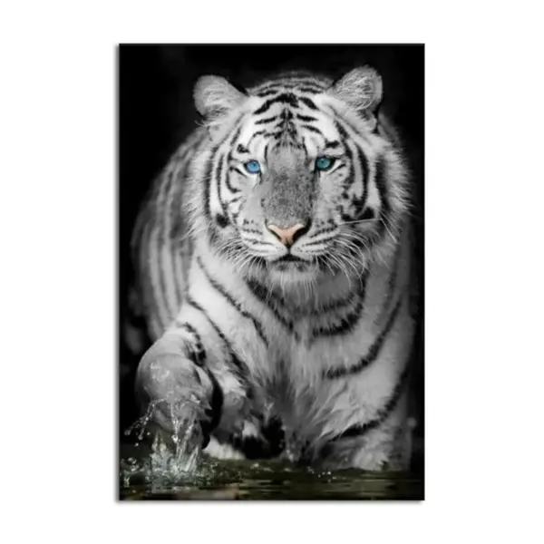 Stunning blue-eyed snow tiger art print captures the rare beauty of this majestic wild cat. High-quality wildlife wall art perfect for nature lovers and animal enthusiasts.