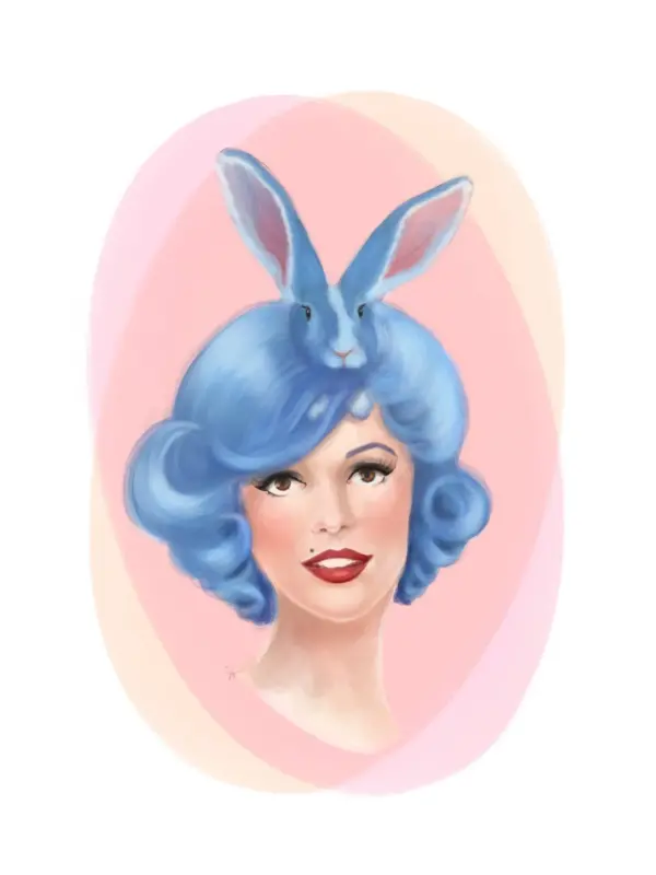 Blue Haired Vintage Pinup Girl Bunny Rabbit Lover Art Print Poster Vintage Girls With Animals On Their Heads
