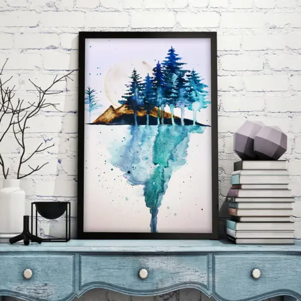 High-quality Blue Moon Forest mountain posters and canvas prints. Transform your space with stunning watercolor art and moon-themed decor. Perfect wall art for nature lovers.