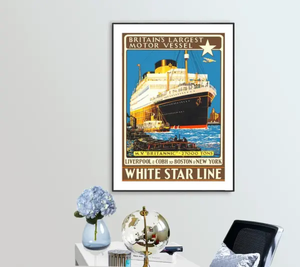 High-quality art prints, stickers, and canvas prints featuring a vintage travel poster design of Britain's largest motor vessel from the White Star Line. Perfect gift!