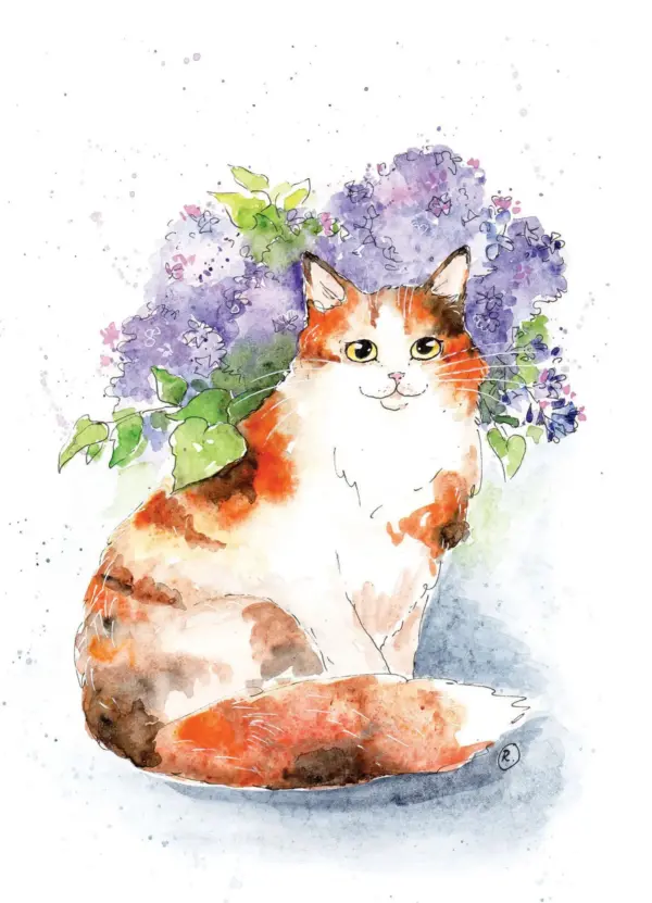 Calico Cat Printable Art Wall Print Watercolor Cat Flowers Animal Lover Gift Cute Cat