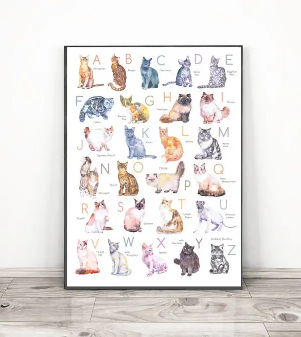 Cat Alphabet Poster Cat Breeds Watercolor Nursery Wall Art Cat Lover Gift