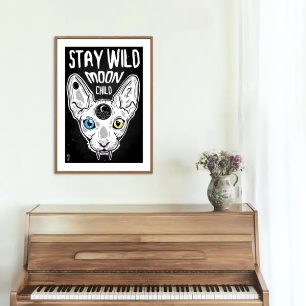 Cat Art Poster Print Stay Wild Moon Child Sphynx Cat Print Goth Wall Decor Gothic Aesthetic Black White Wall Art Housewarming
