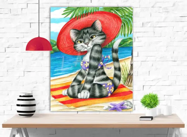 Cat Art Print A Purrfect Day Cat In Red Hat And Bikini On The Beach Artist Signed Fine Art Print Great Cat Lover Gift