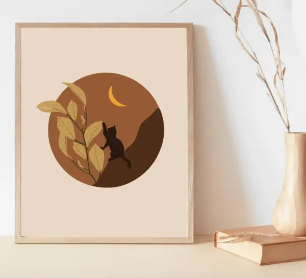 Cat Art Print Cat Moon Print Cat Lover Wall Art Kitty Poster Landscape Art Print Boho Wall Print Leaves Art Print Witchy Art
