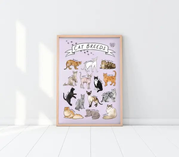 Cat Breeds Illustrated Art Print Unique Cat Lover Gift Home Gallery Wall Decor Lilac Blue Pink Green