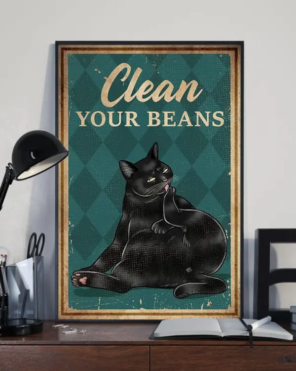 Cat Clean Your Beans Poster Wall Poster Retro Style Funny Kitty Poster