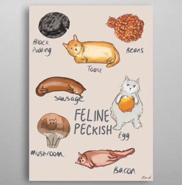 Cat English Breakfast Pun Wall Art Funny Hand Drawn Illustration Feline Peckish Quirky Colourful Kitchen Decor Cat Lovers Gift