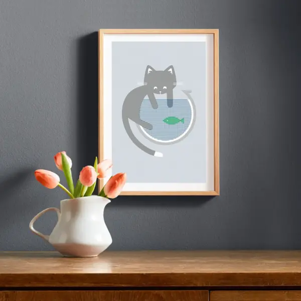 Cat Fishbowl Risograph Printed Wall Art Wall Decor Cm