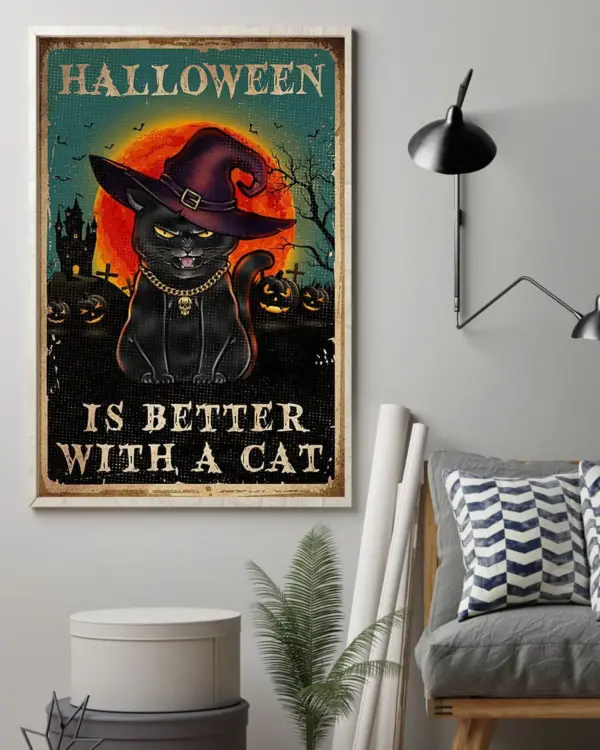 Cat Halloween Is Better With A Cat Poster Wall Poster Retro Style Funny Kitty Poster