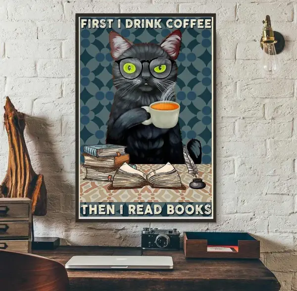 Cat Librarian First I Drink The Coffee Then I Read Books Poster