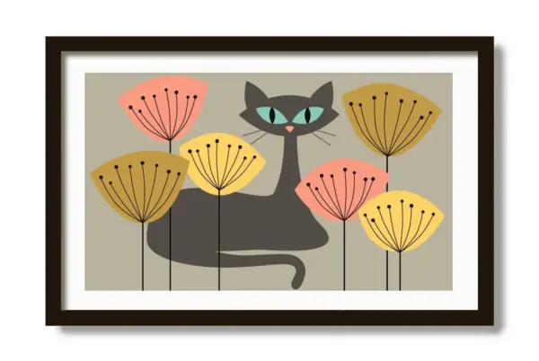 Mid Century Modern Cat Art Print - Floral Tulip Design