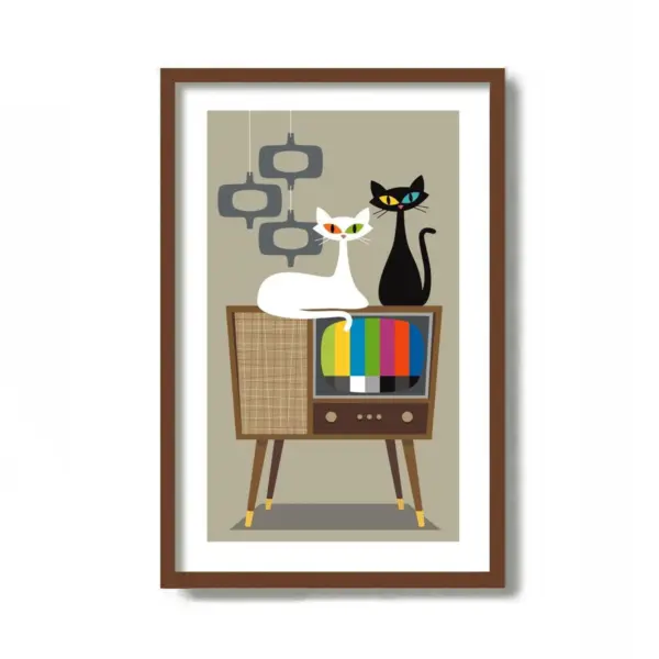 Cat Lover Gift Women Black Cat Art Print Mid Century Modern Wall Art Cat Art Print White Cat Art Old Television Black Cat Gift
