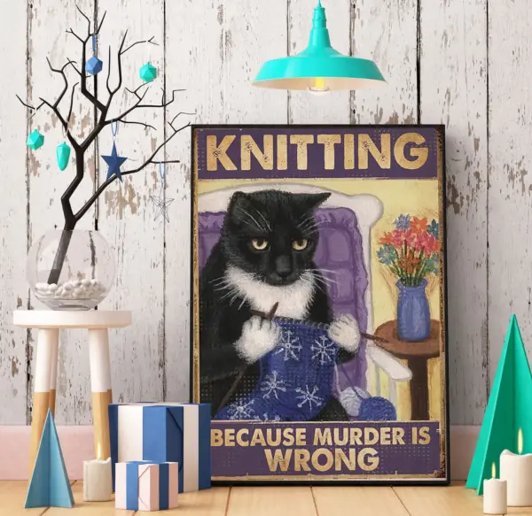 Cat Lovers Poster Knitting Cat Because Murder Is Wrong Vertical Poster Cat Vertical Art Print Black Cat Art Wall