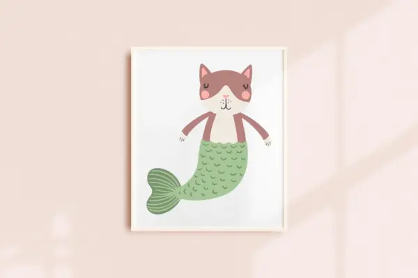Cat Mermaid Illustration Kids Room Poster Cute Happy Soft Children Poster Nursery Painting For Cat Lover Moms