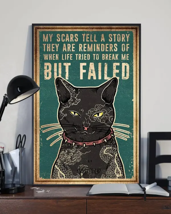 Unique vintage-style cat poster celebrating resilience and humor. Perfect wall art for cat lovers featuring a witty design that tells a story of strength and character.