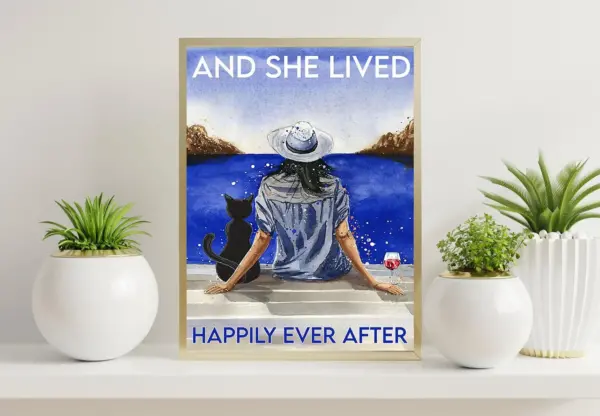 Cat Poster And She Lived Happily Ever After Poster Funny Black Cat Art Girl Drink Wine And Cat Poster Cat Lover Gift Wall Art