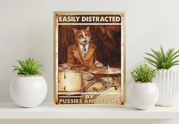 Cat Poster Easily Distracted By Pussies And Drums Poster Funny Vest Cat Art Living Room Decor Gift For Drummer Cat Lover Poster