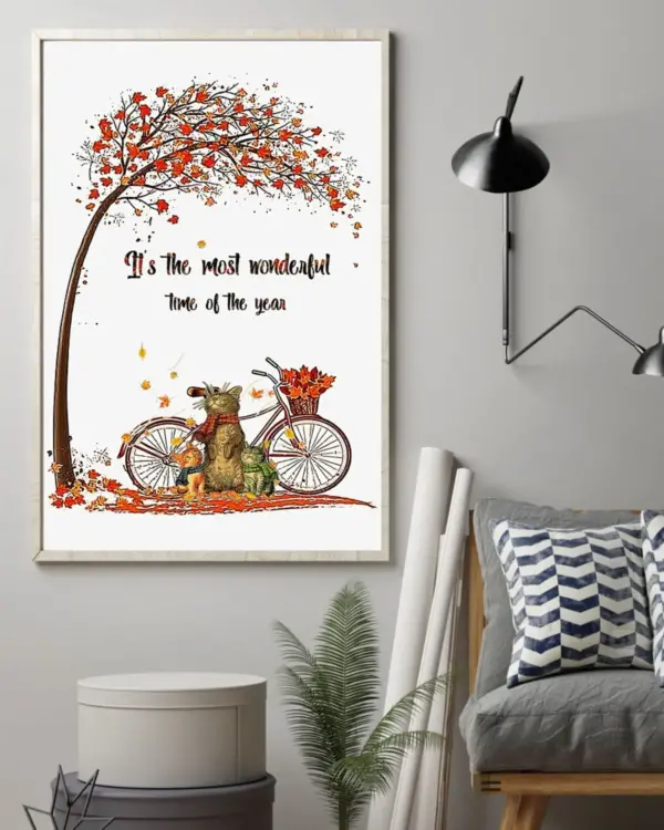 Cat Tree Autumn It S The Most Wonderful Time Of The Year Poster Cats Cute Bicycle Beautiful Painting Gift Lover Autumn Decor Wall Unframed