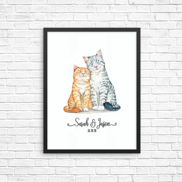 Cat Wall Art Custom Name Print Personalized Couple Wedding Decor Tabby Cat Sign Newlywed Gift Poster Valentine Housewarming Gift