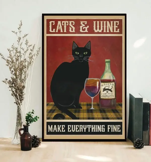 Cats And Wine Make Everuthing Fine Poster Drinking Wine Poster Cat Lover Gift Funny Black Cat Poster Retro Cat Print Cat Owners Gifts