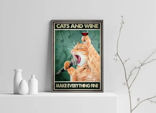 Cats And Wine Make Everything Fine Poster Funny Cat Art Print Wine Poster Drunk Cat Print Vintage Poster Cat Lover Gift Signs For Home